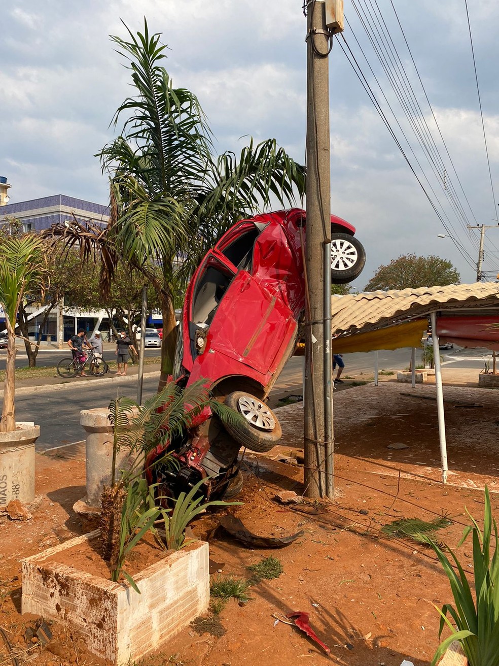 Carro parou 'escorado' em poste após capotamento em Ceilândia, no DF — Foto: Corpo de Bombeiros do DF/ Divulgação