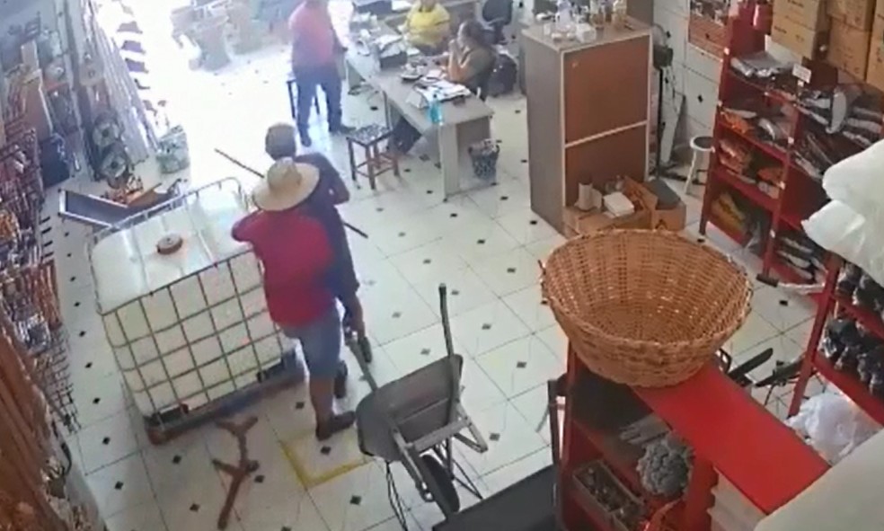 Um dos bandidos se aproxima de duas funcionárias e recolhe os dois celulares, enquanto o outro de camisa vermelho e chapéu de palha vai até as atendentes e leva o dinheiro.