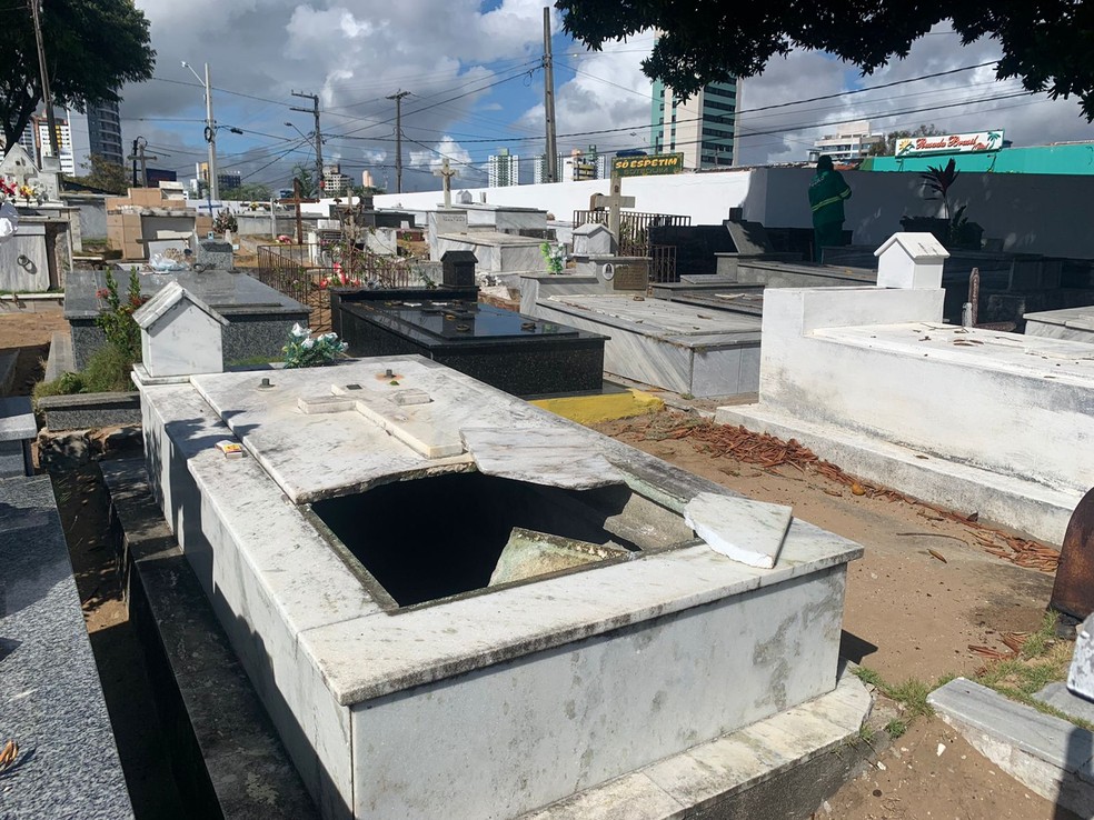 Criminosos roubam peças e depredam túmulos no cemitério de Ponta Negra, na Zona Sul de Natal — Foto: Anna Alyne Cunha/Inter TV Cabugi
