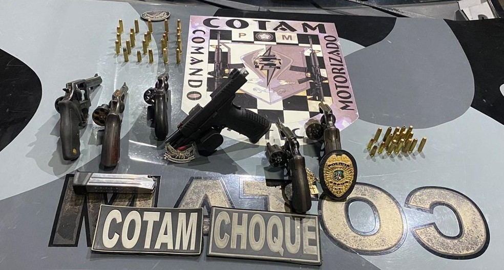Ainda conforme o agente, as armas estavam escondidas em uma bolsa que estava com os suspeitos. "Eram cinco revólveres e uma pistola de origem estrangeira, que tinha um dispositivo para ficar semiautomática e como uma arma automática, para mostrar poder de fogo", disse o tenente do Cotam.