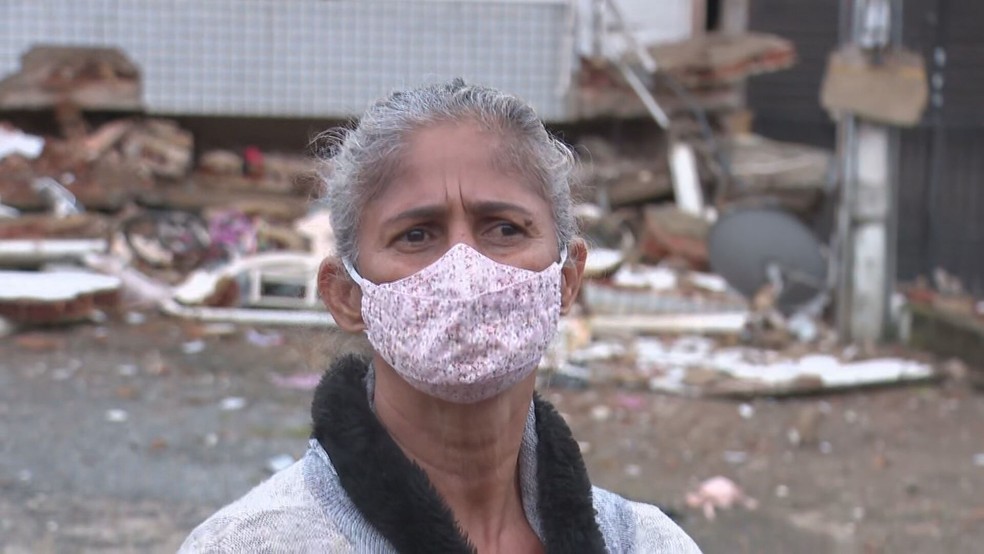 "Eu não estava me sentindo bem. Eu já estava sentindo um aperto no coração e, quando nós entramos na loja, eu meu neto e esposo, abrimos a porta e um pedacinho do reboco caiu. Aquilo me deu uma aflição na hora", continua.