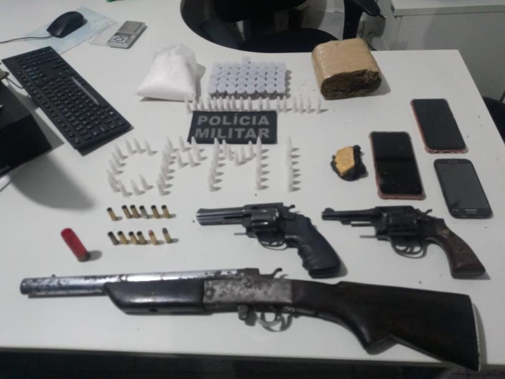 No carro, a polícia encontrou dois revolveres, uma espingarda calibre 12, um quilo de maconha, 500 gramas de crack e 500 gramas de cocaína.
