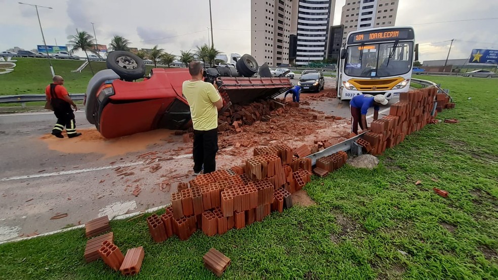 Caminhão carregado de tijolos tomba em acesso a Viaduto de Ponta Negra em Natal — Foto: Sérgio Henrique Santos/Inter TV Cabugi