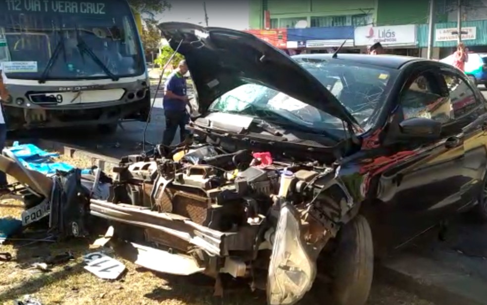 Um carro ficou com a frente destruída e três pessoas ficaram feridas depois de uma batida contra um ônibus do Eixo Anhanguera, na manhã deste sábado (18), em Goiânia. Imagens mostram o estrago causado nos dois veículos (veja acima).