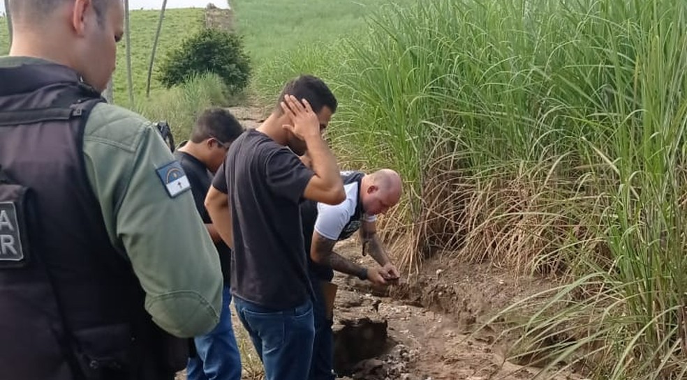Polícia e, de preto, suspeito de envolvimento na morte dos pais e da irmã no local em que corpos das vítimas foram achados, em Nazaré da Mata — Foto: Reprodução/WhatsApp