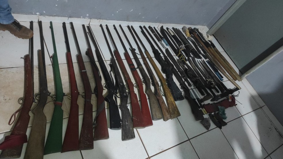 A PRF perseguiu o ônibus, até que o motorista parou e foi abordado. Dentro do veículo foram encontradas várias armas de fogo (espingardas), munições e armas brancas, principalmente facões.