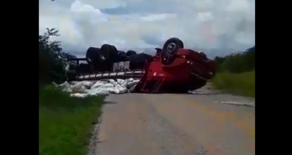 Um caminhão carregado com soja tombou na manhã desta segunda-feira (15) na RN-117 no município de Olho D'Água do Borges, na Região Oeste do Rio Grande do Norte.
